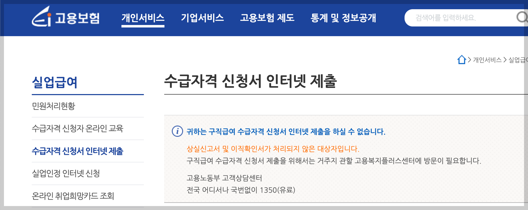 앞선 작업이 완료되면 구직급여 수급자격을 신청할 수 있다. 신청은 관할지역 고용보험센터에 오프라인으로 직접 방문하여 신청할 수 있고, 사이트에서 가능한 경우 센터에 방문하지 않고 온라인으로도 신청할 수 있다. 그런데 나의 경우에는 인터넷으로 신청이 불가능하다고 나와 오프라인 센터에 직접 방문하여 신청을 완료하였다.
