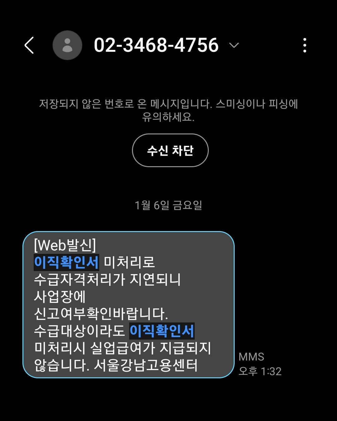 오프라인으로 신청했으니 이제 별일 없겠지 하고 기다리고 있는데, 갑자기 고용센터에서 고용센터에서 이직확인서 미처리로 수급자격처리가 지연되고 있다는 문자를 받았다. 관련하여서는 바로 이전 회사에 메일로 전달하였고 바로 재접수가 신청된 것 같았다.