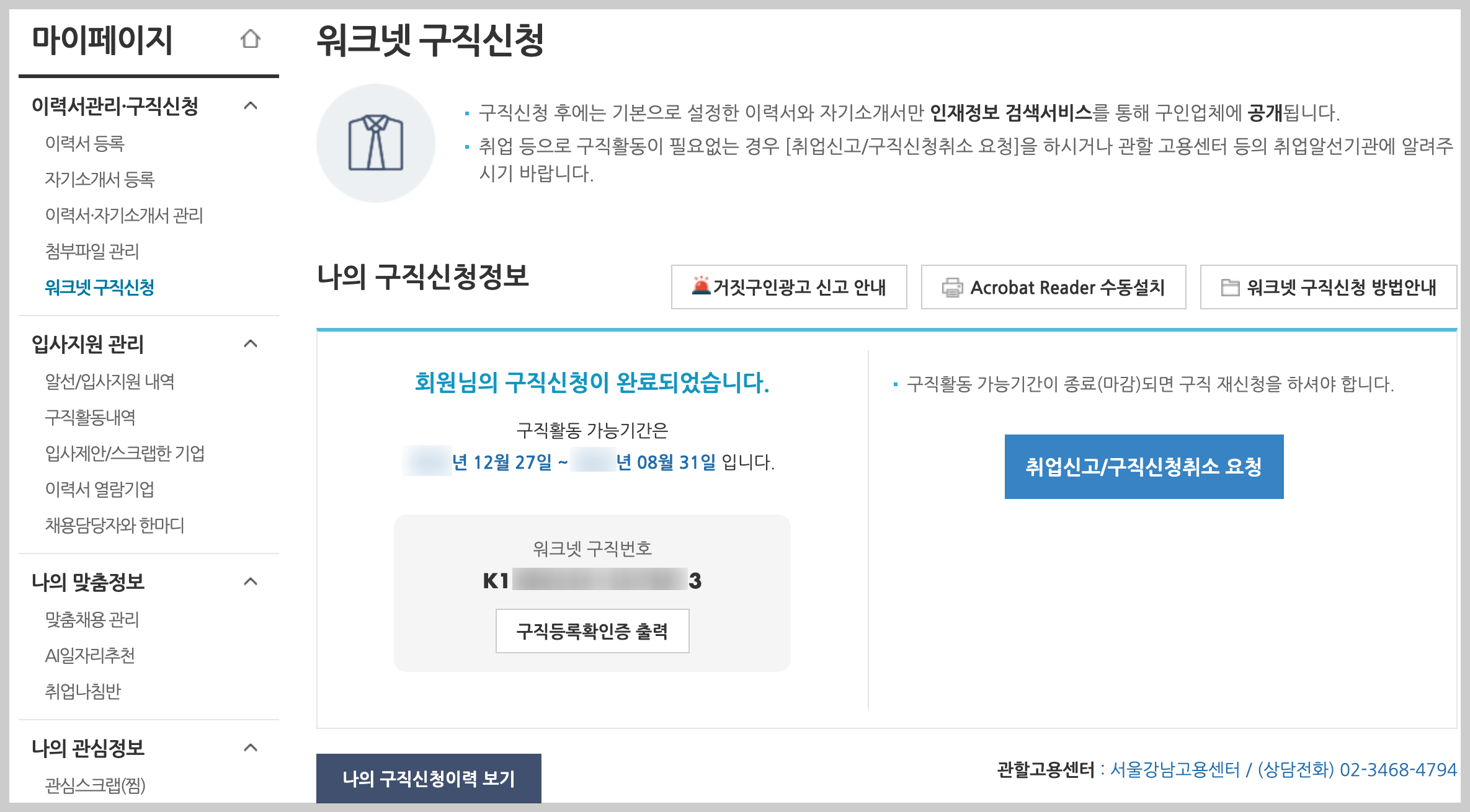 - 워트넷 구직신청이 완료되면 아래와 같이 <워크넷 구직번호>가 나타난다. (알파벳 포함 16자리)