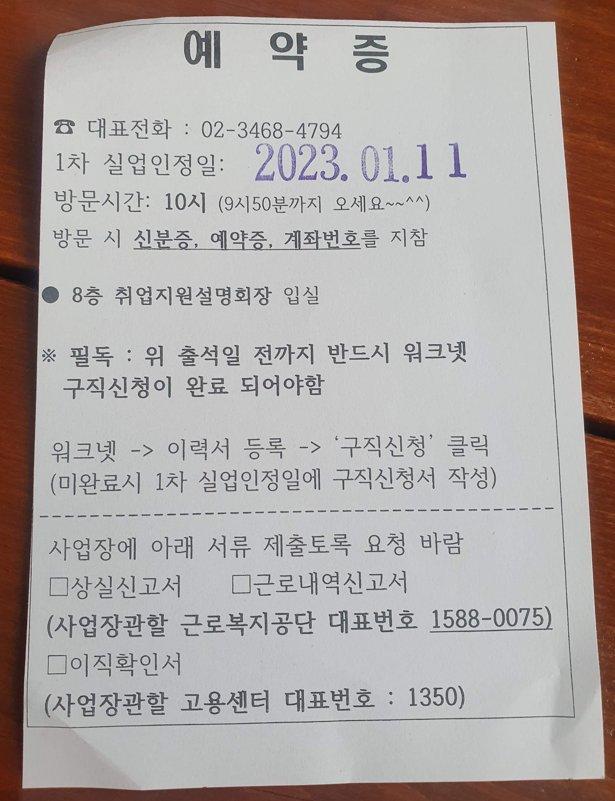 마지막으로 '구직급여 수급자격 신청' 을 위해 선터에 방문할 당시 담당자로부터 <1차 실업인정 교육> 에 대한 오프라인 참석 안내와 예약증을 교부 받았다. 해당 날짜에 센터에 방문할 때에는 '신분증, 예약증, 계좌번호'를 꼭 챙겨 참석해야 한다.