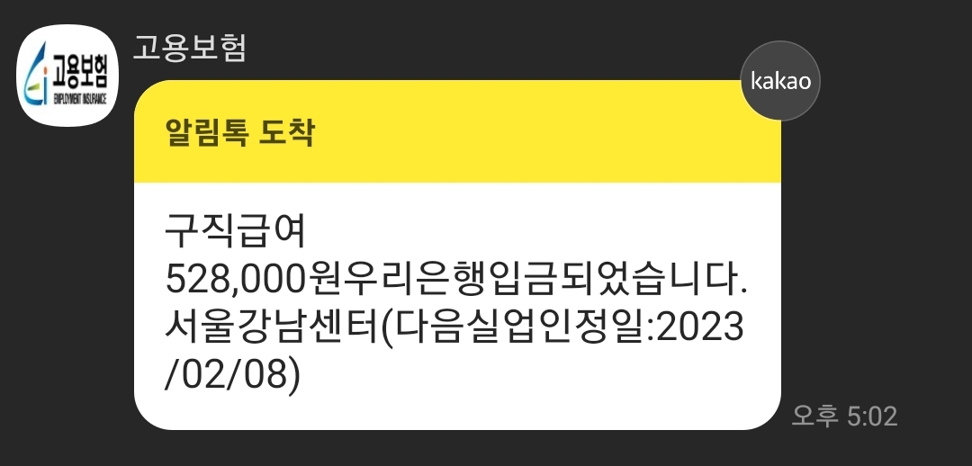 이 단계가 모두 끝나고 나면, 1차 실업인정이 완료되어 구직급여 금액이 빠르면 1일 내 늦어지면 3일 정도의 시간이 소요되어 입금된다. 나의 경우 제출한 계좌로 하루 내 지급된다. 지급이 완료되면 아래와 같은 문자가 발송된다. 실제 은행에 입금내역까지 확인 완료하면 1차 지급은 완료!!