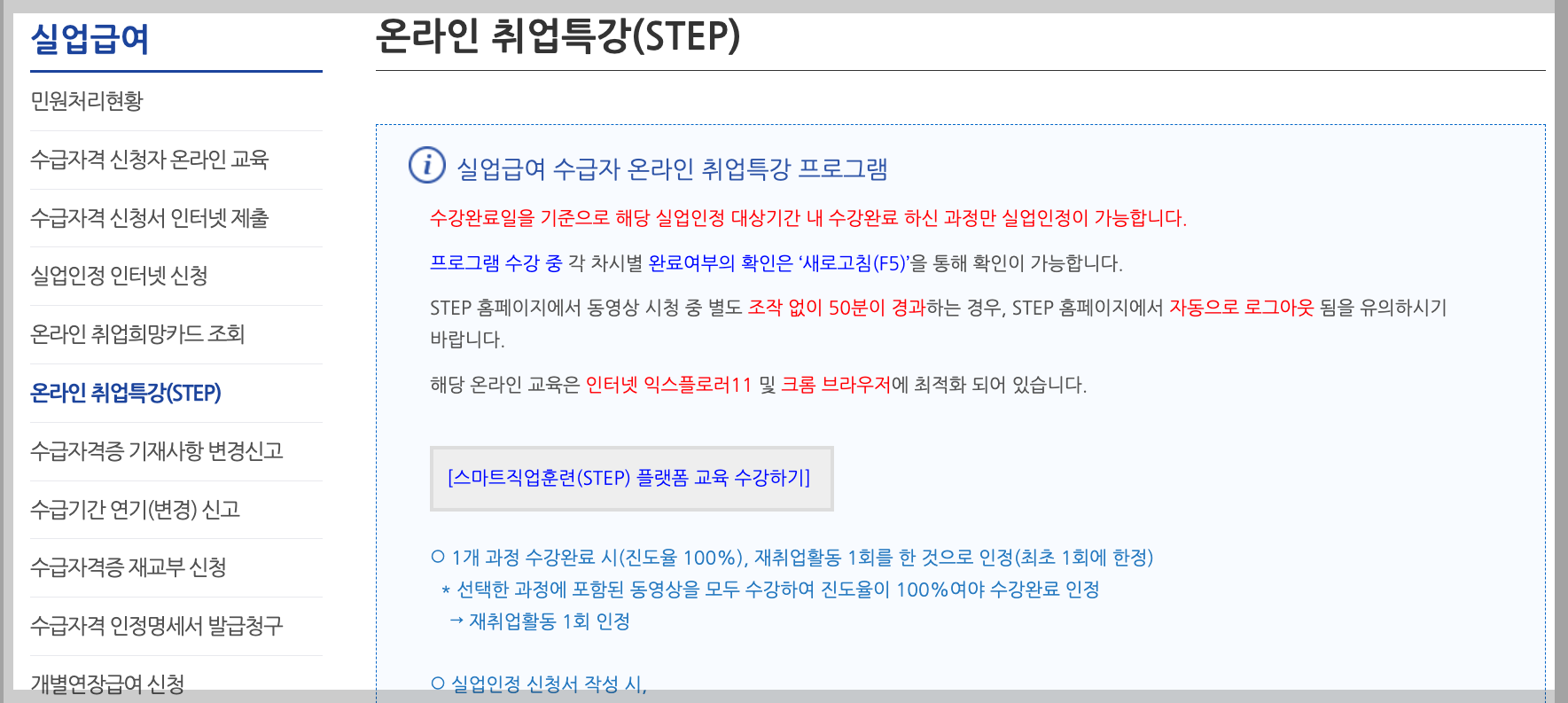 3. '개인서비스' 내 '온라인 취업특강(STEP)' 페이지가 나타나고, 페이지 중간 [스마트직업훈련(STEP) 플랫폼 교육 수강하기] 버튼 클릭