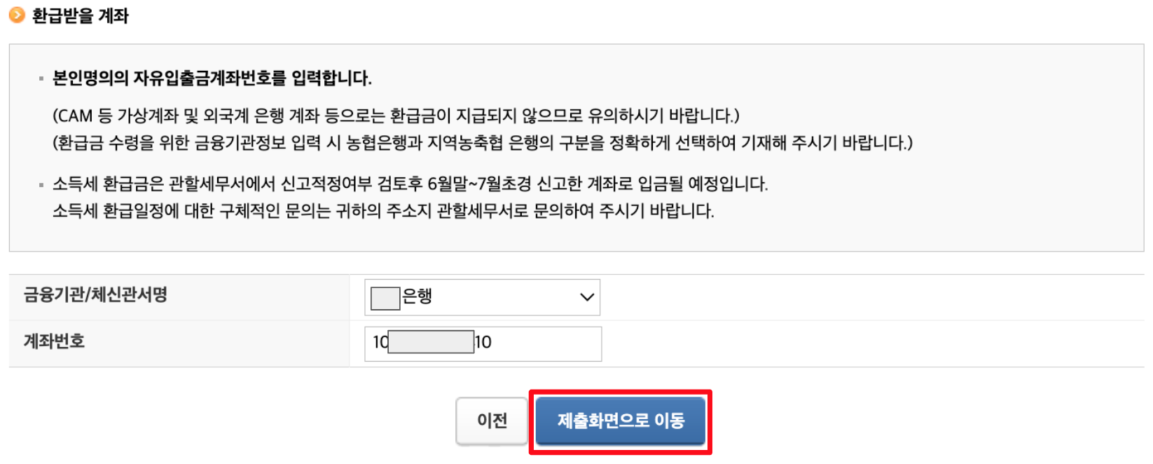 환급받을 금액이 있다면, 은행계좌 정보를 하단에 기재한 후 [제출화면으로 이동] 버튼을 클릭하면 된다.