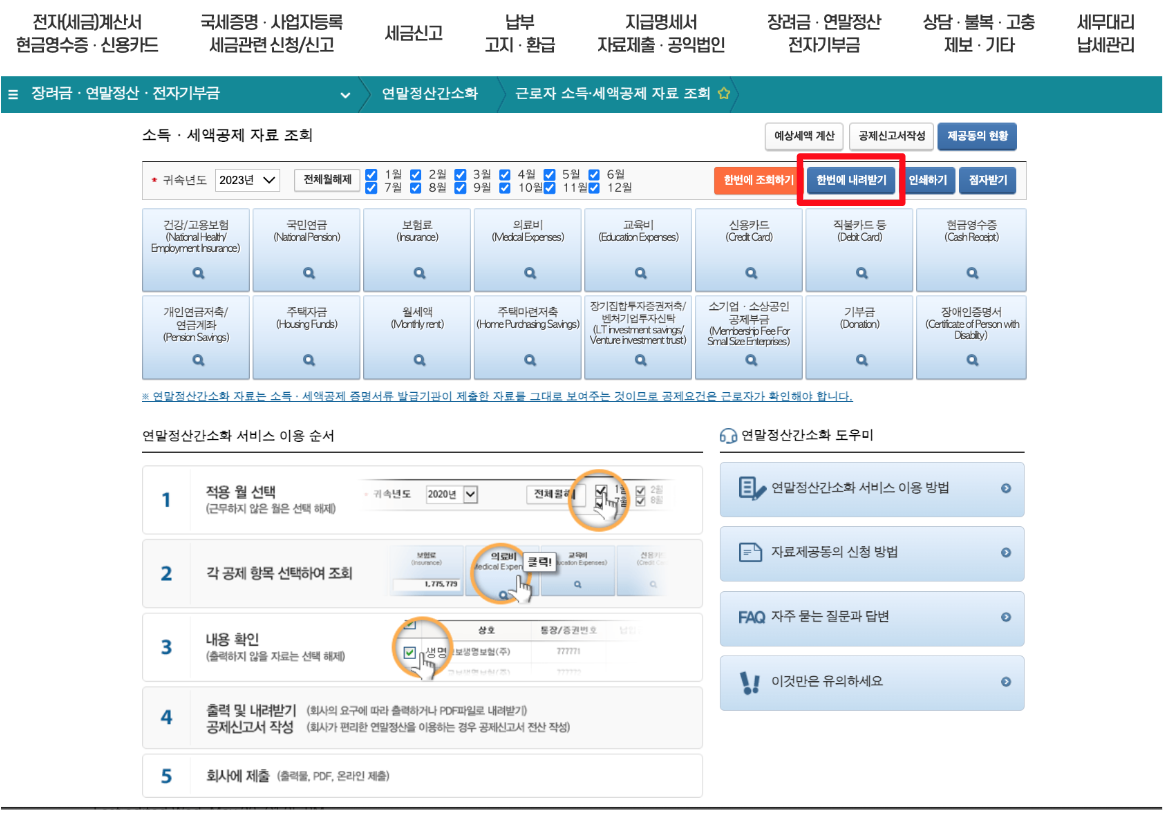 직장인이라면 다들 알고 있는 연말 정산 페이지 - 돋보기 버튼을 모두 클릭한 후 [한번에 내려받기] 버튼을 클릭하다.