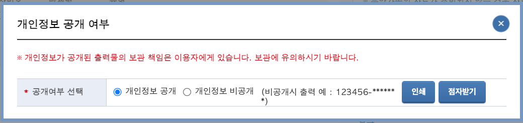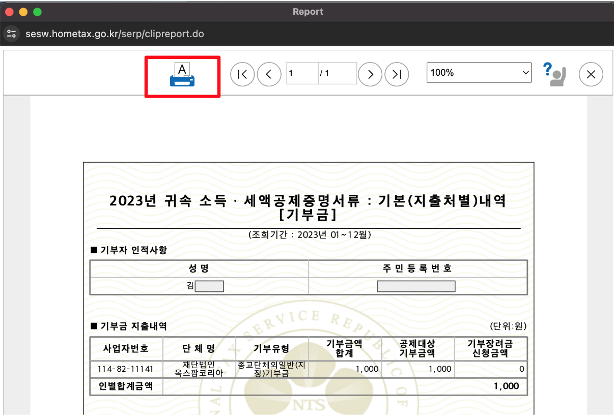 돋보기 버튼을 모두 눌러 금액이 나타나는 항목의 서류를 [인쇄하기/전자점자 내려받기] 버튼을 클릭해 PDF 파일로 출력한다.