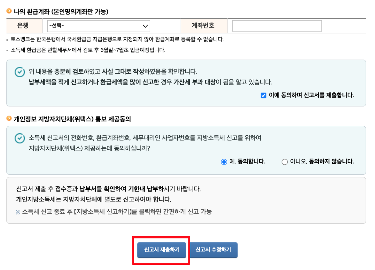 일단 첫 단계에서는 환급 시 수령할 금액을 돌려 받을 수 있는 은행을 선택하고 해당하는 계좌번호를 기재하면 된다. 하단의 버튼들도 동의에 클릭하고 맨 마지막의 [신고서 제출하기] 버튼을 클릭한다.