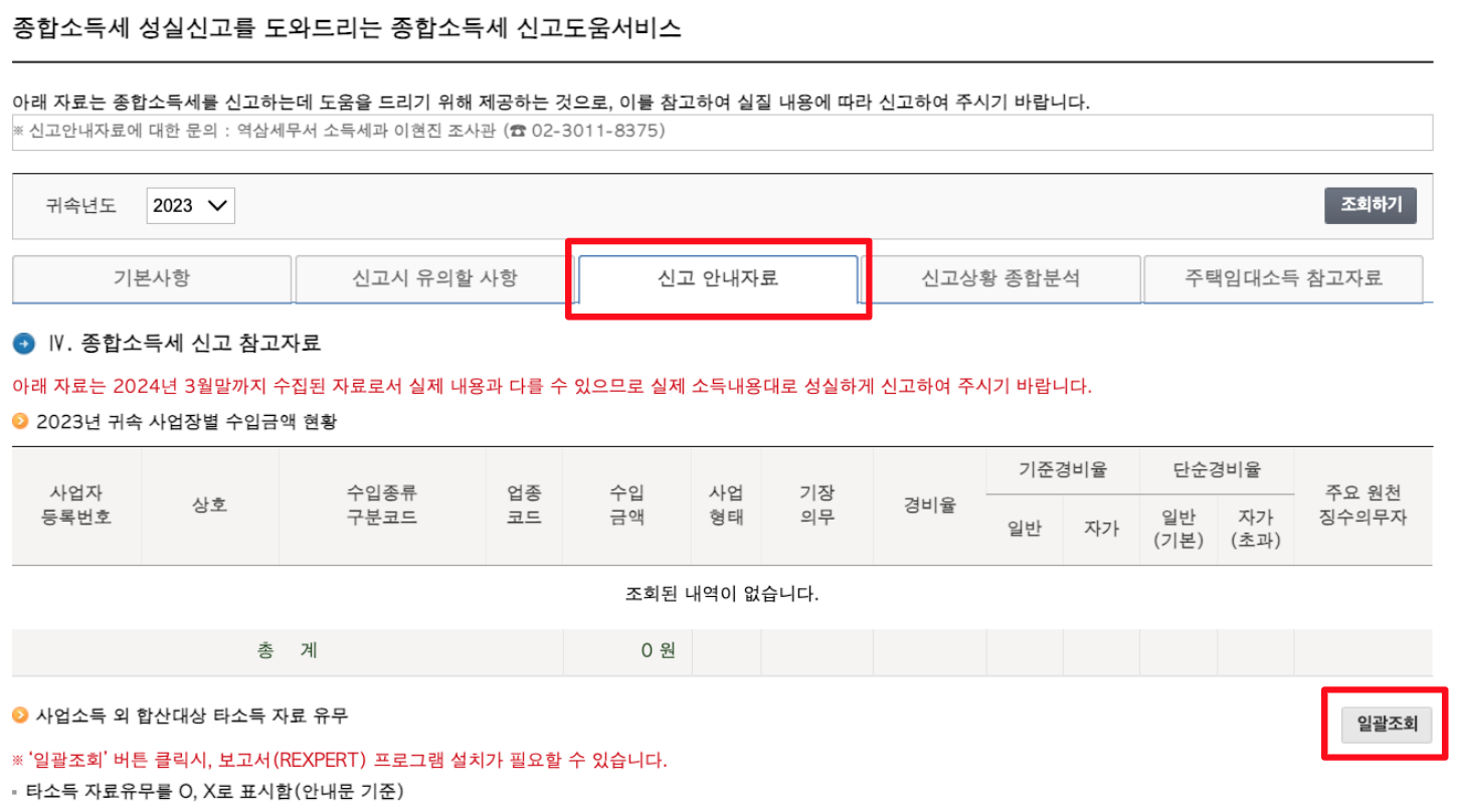 그리고 더 아래에 '종합소득세 신고 참고자료' 파트 하단의 [일괄조회] 버튼을 클릭한다.