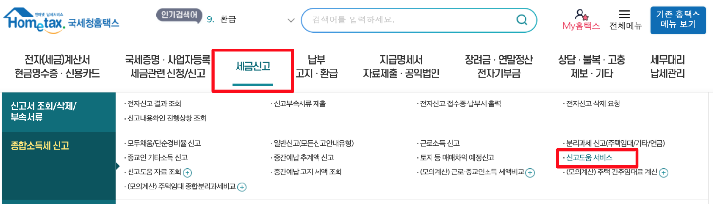 홈택스 로그인 상태에서 상단의 <세금신고> 탭의 [신고도움 서비스] 버튼을 클릭한다.