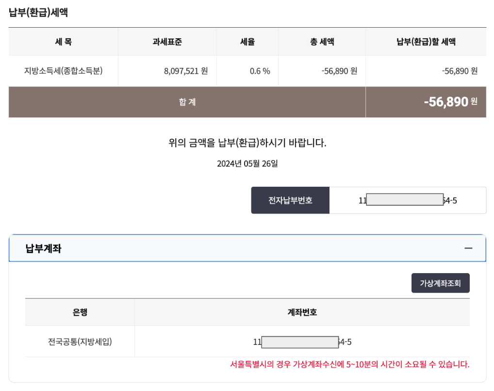 최종 납부할 금액과 계좌번호 확인이 가능하다~ 전자납부 번호가 뭔가 했는데 그게 그냥 계좌번호인가보다. 난 납부 대상은 아니라서 모르겠지만 은행은 뭘로 선택을 하는거지? 암튼 이렇게 확인하고 납부까지 하면 진짜 끝이다.