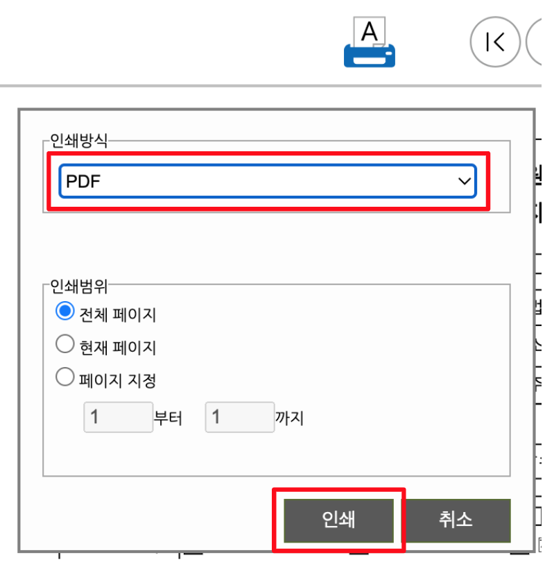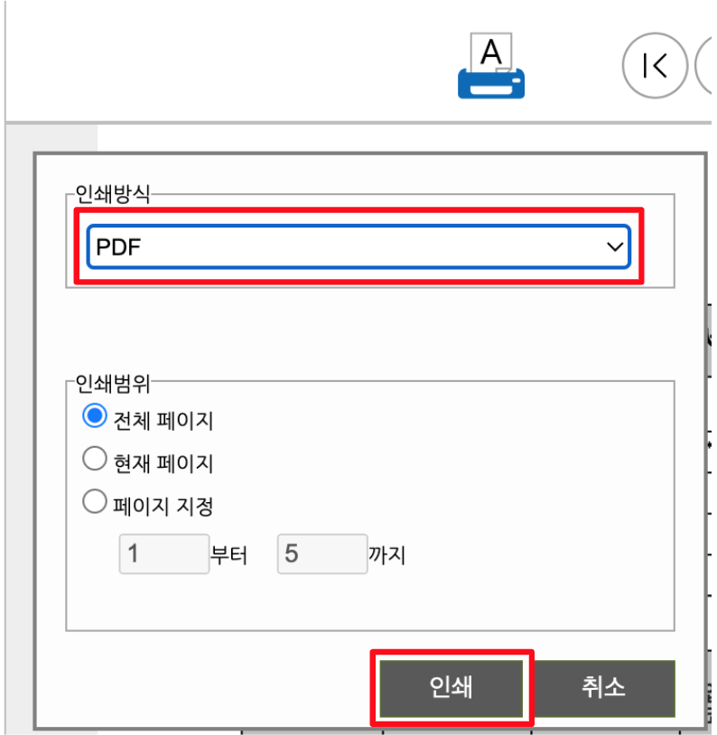 팝업창으로 미리보기 내용이 뜨면, [인쇄] 버튼을 클릭해 파일을 PDF 로 저장한다.
