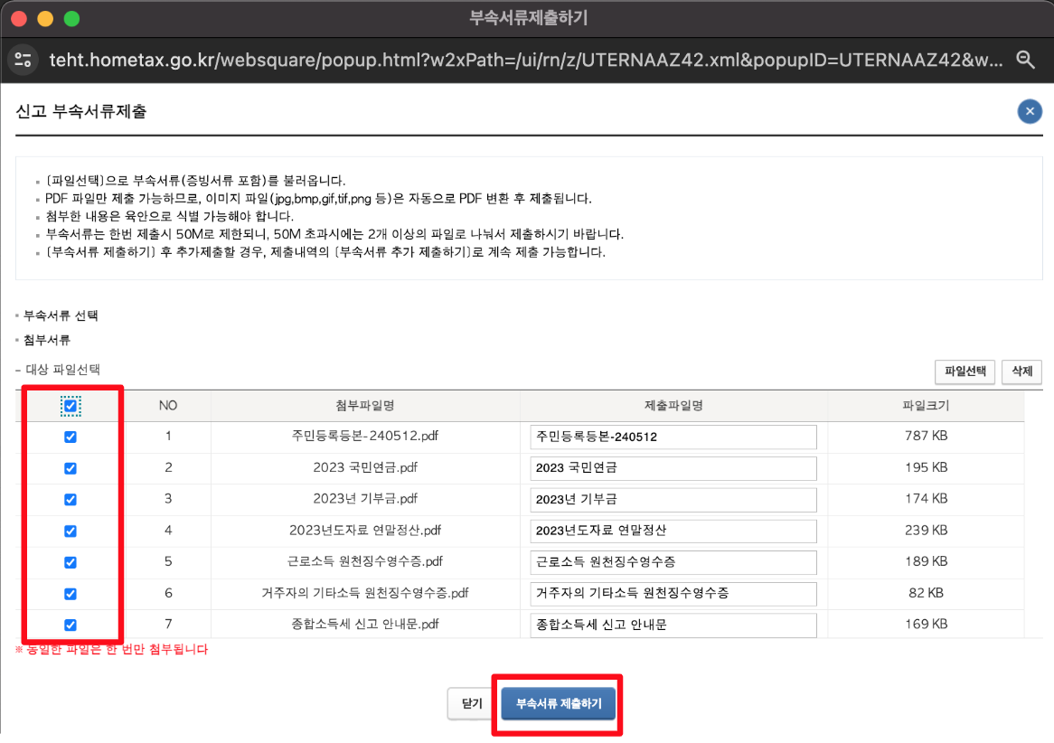 제출하려는 파일을 모두 선택한 후 하단의 [부속서류 제출하기] 버튼 클릭하면 첨부 서류 제출 모두 완료!
