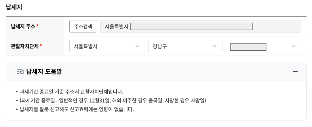신고인 정보 중 필수 입력 항목을 채우고, 하단의 납세자는 <신고인과 동일> 버튼을 클릭해 동일하게 채우면 된다. 아마도 신고인과 납세자가 다른 경우는 거의 없을 듯