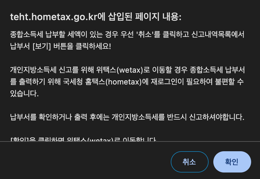 근데 신기하게 신고 종류를 선택하기 전, 로그인을 하니 아래와 같이 <맞춤형 신고 안내> 팝업창이 뜨고, 어떤 건으로 세금신고를 해야하는지 알려주어서 바로 [예(신고하기)] 버튼을 눌러 해당하는 페이지로 이동할 수도 있다.