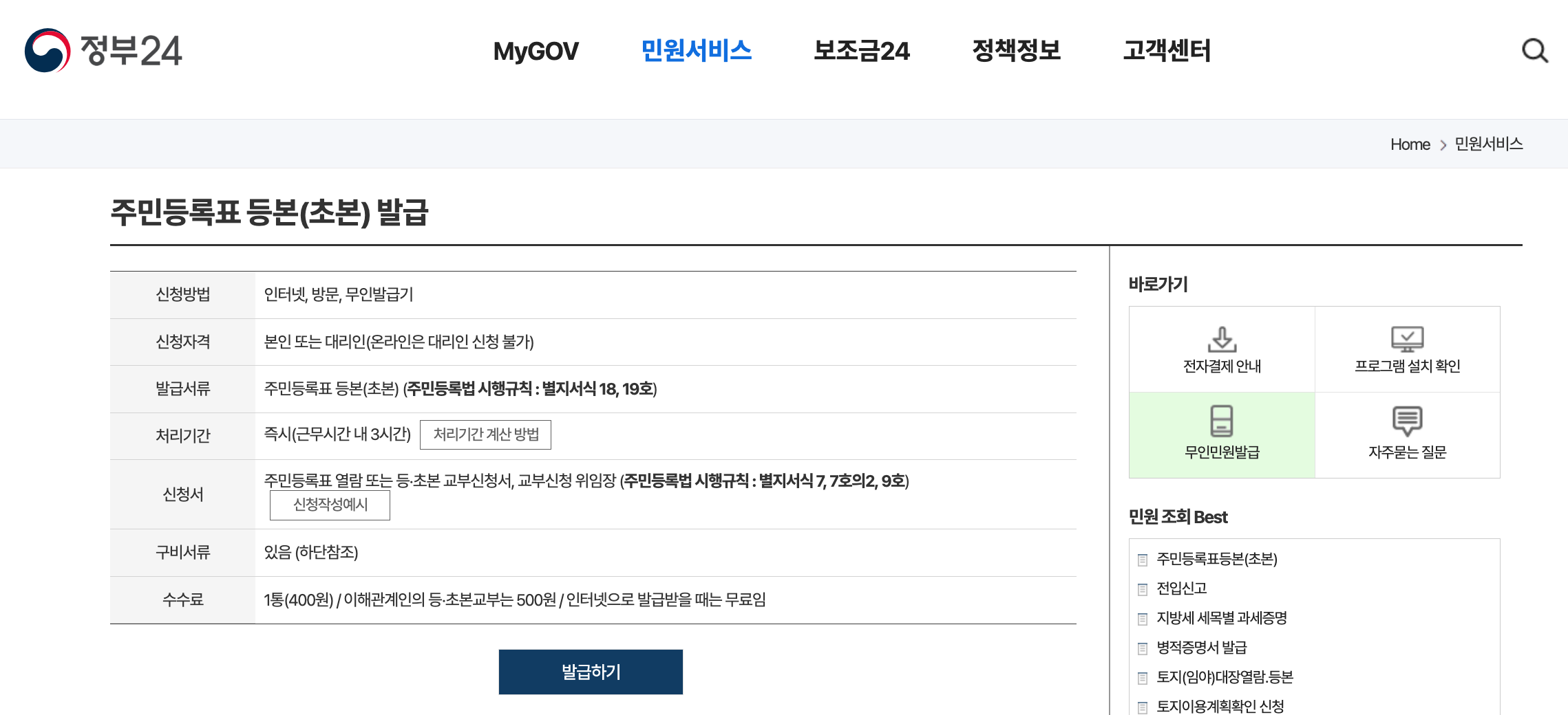 정부24 사이트 접속 후 주민등록등본 버튼 클릭(링크) 후 [발급하기] 버튼을 눌러 회원 또는 비회원 로그인 후 서류 신청 및 다운로드
