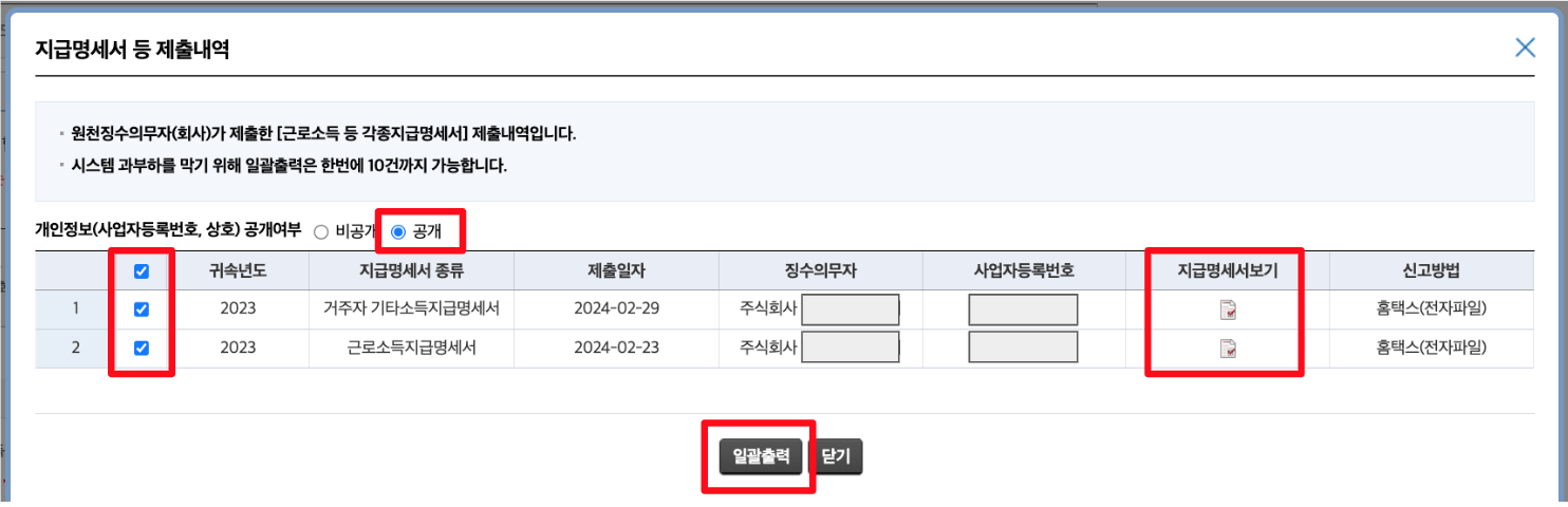 팝업창에 <지급명세서 등 제출내역> 내용이 뜨면 1) 공개 버튼 클릭, 2) 전체 리스트 체크박스 선택, 3) 일괄출력 or 지급명세서보기 버튼을 순서대로 클릭한다.