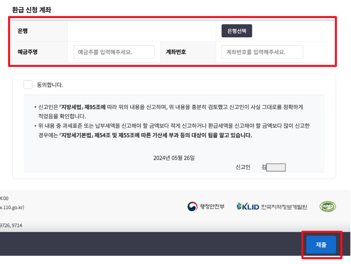 여기서는 앞 단계에서 입력 및 확인한 내용을 한 페이지에 정리해주고, 맨 마지막 파트에 <환급> 금액을 어디로 받을 것인지 계좌번호를 입력하는 란이 있다. 여기만 잘 기재하고 [제출] 버튼을 클릭하면 끝!