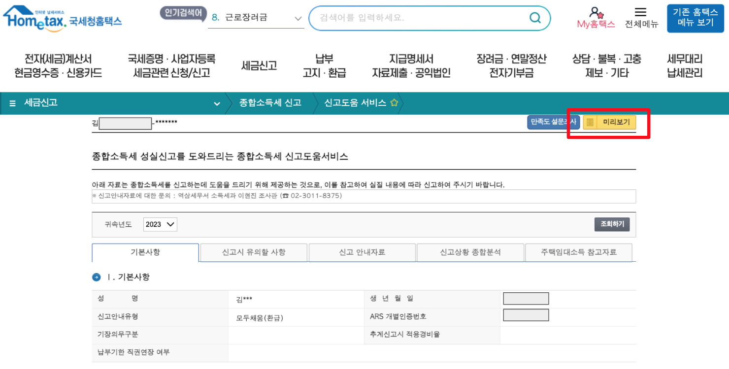 다음으로 조회된 내용 상단의 [미리보기] 버튼을 클릭한다.